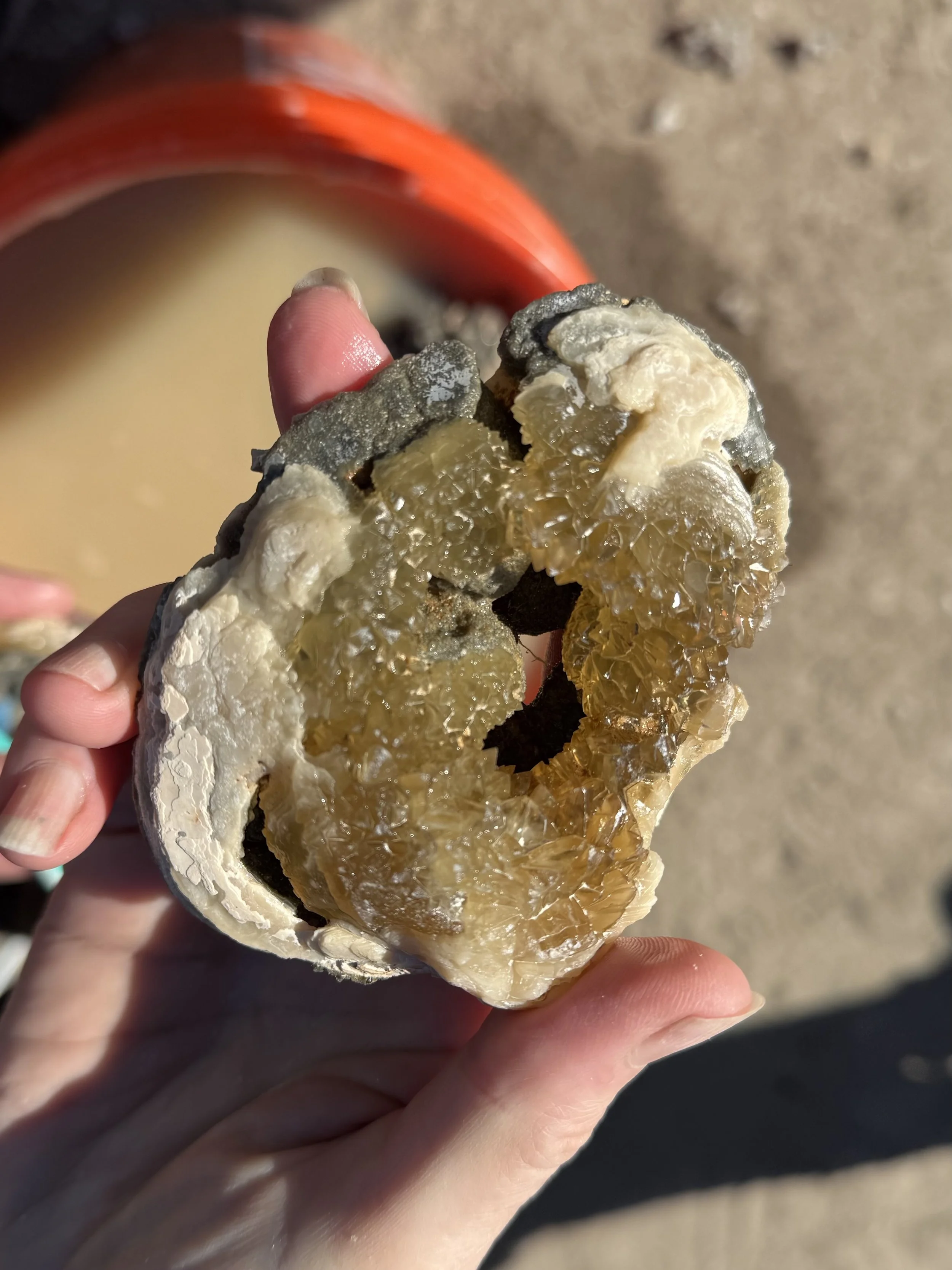 “Kyndall and Frank advised that we take what we found home and clean it if we wanted. Great suggestion, I ended up with a lot more calcite than I thought. However if you wanted to rinse what you found there, they put out buckets of water throughout the site. When the dig was almost over they set out buckets of water and chairs near the parking area so you could rinse and leave behind what you didn't want. Kyndall and Frank were out talking to and checking in everyone all during the day. Kyndall was bringing people water and Gatorade as well. Big bonus, they have a 4 wheeler that they would haul your rocks and you back to your car if you needed. They had a cooler with water and Gatorade for anyone that wanted it. They also had buckets and hand tools for you to borrow. And the porta potty was just a few steps away. You'll see from other people's posts how fabulous the machine dig was. I might have to save up and do that. Kyndall and Frank aren't just the owners of the mine, they are the consummate hosts. I am completely spoiled after dig at their mine.”